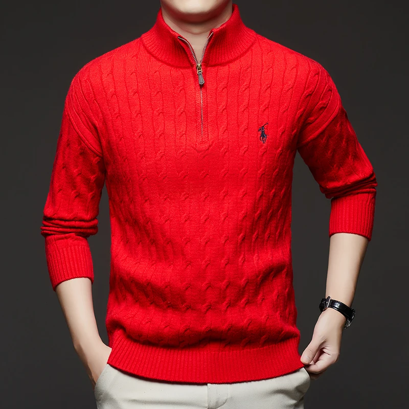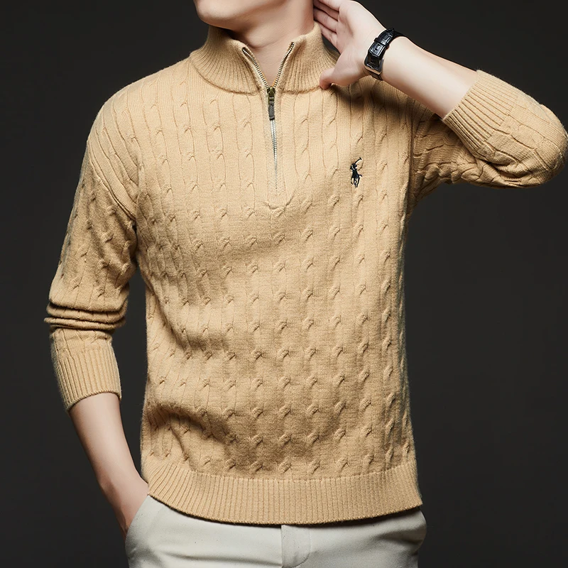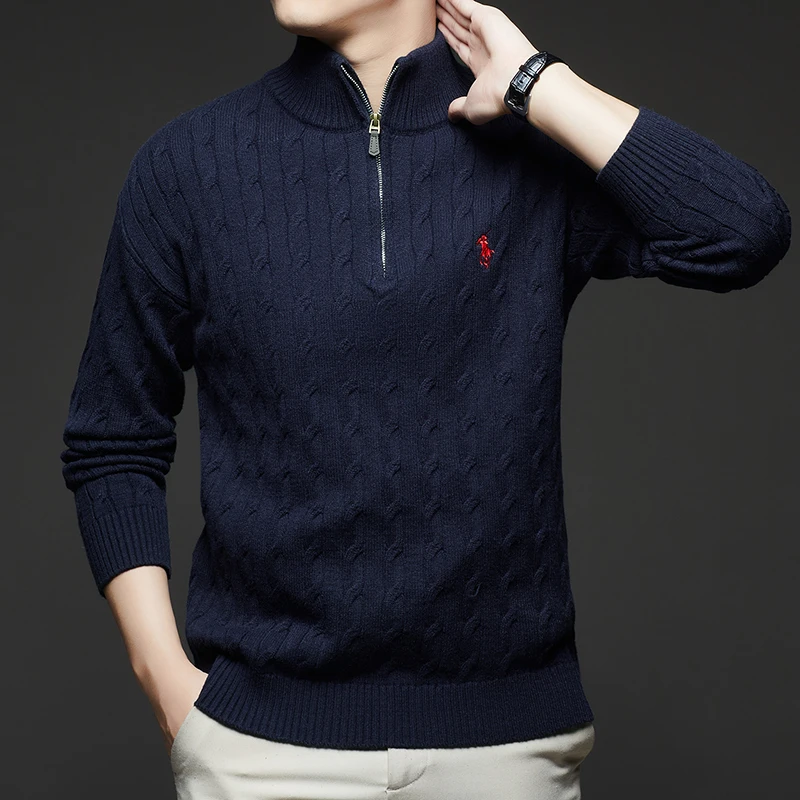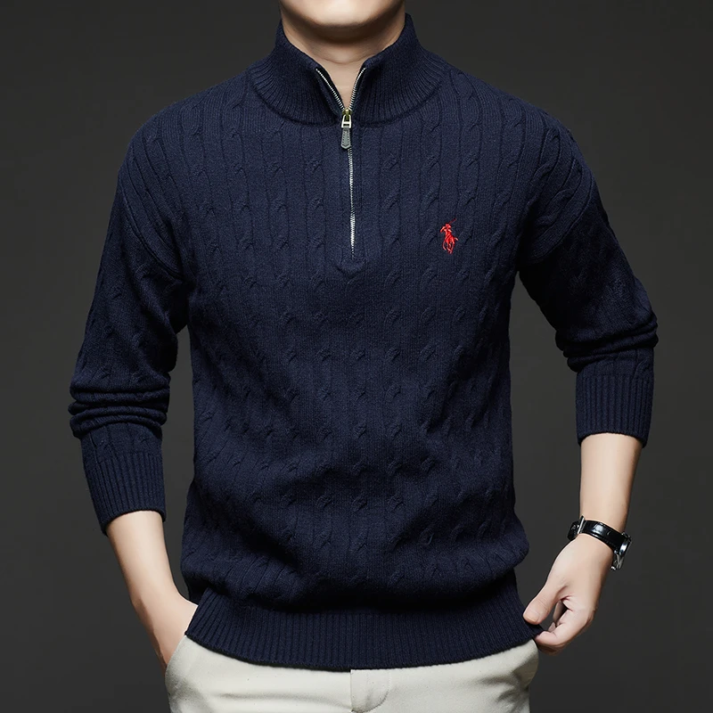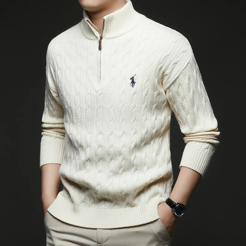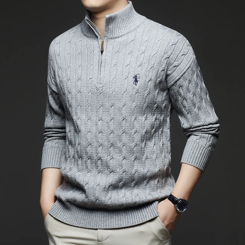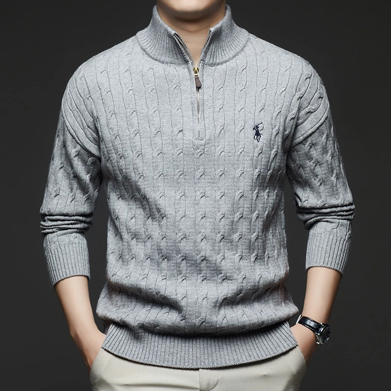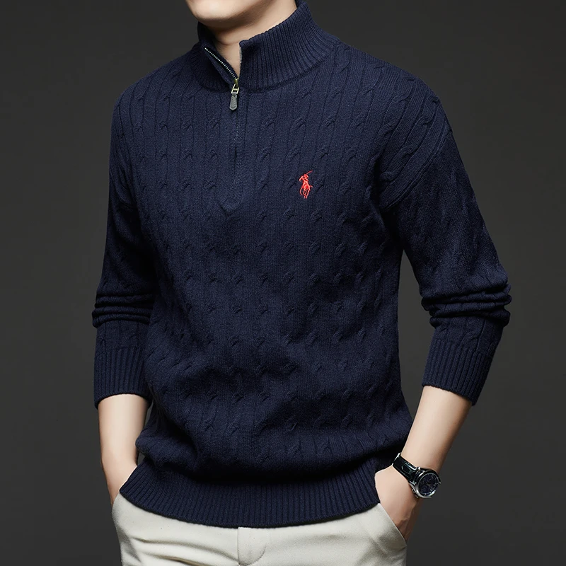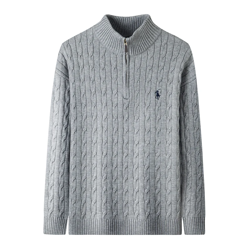 Autumn and Winter New Men's Small Horse Logo Trendy Fashion Half Zipper Autumn and Winter Top Long Sleeved Plaid Sweater Jacket