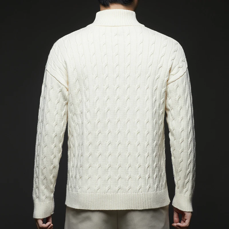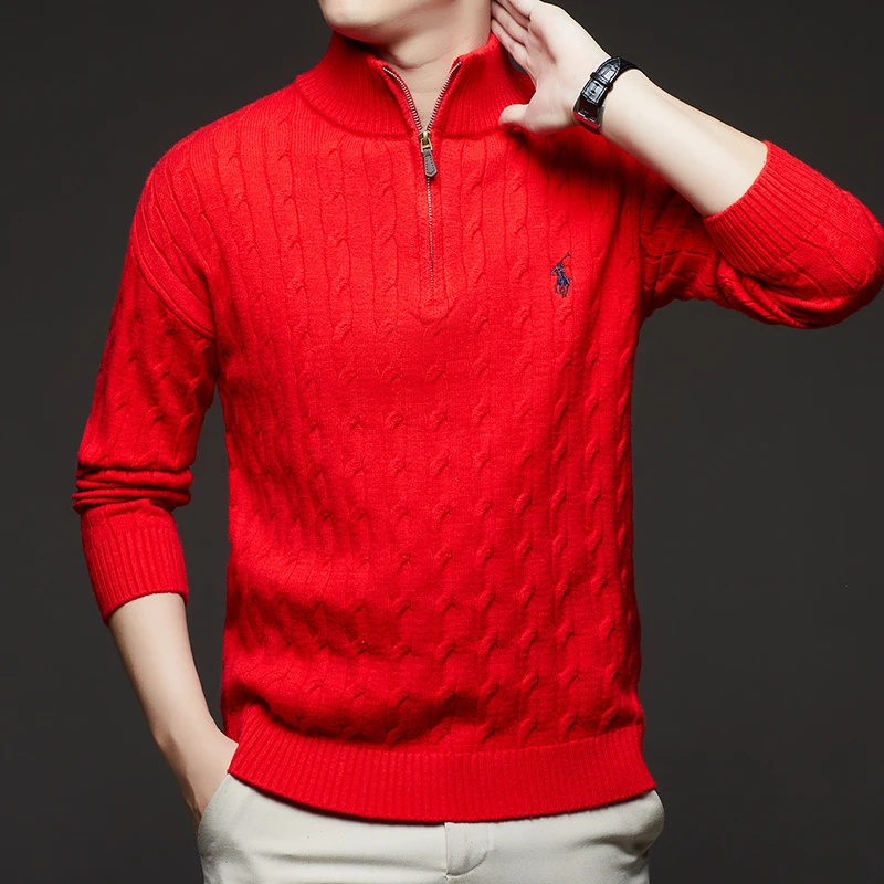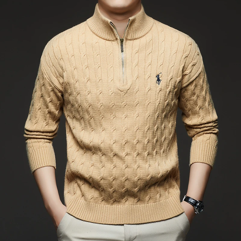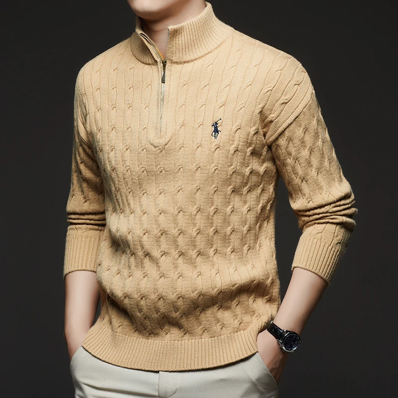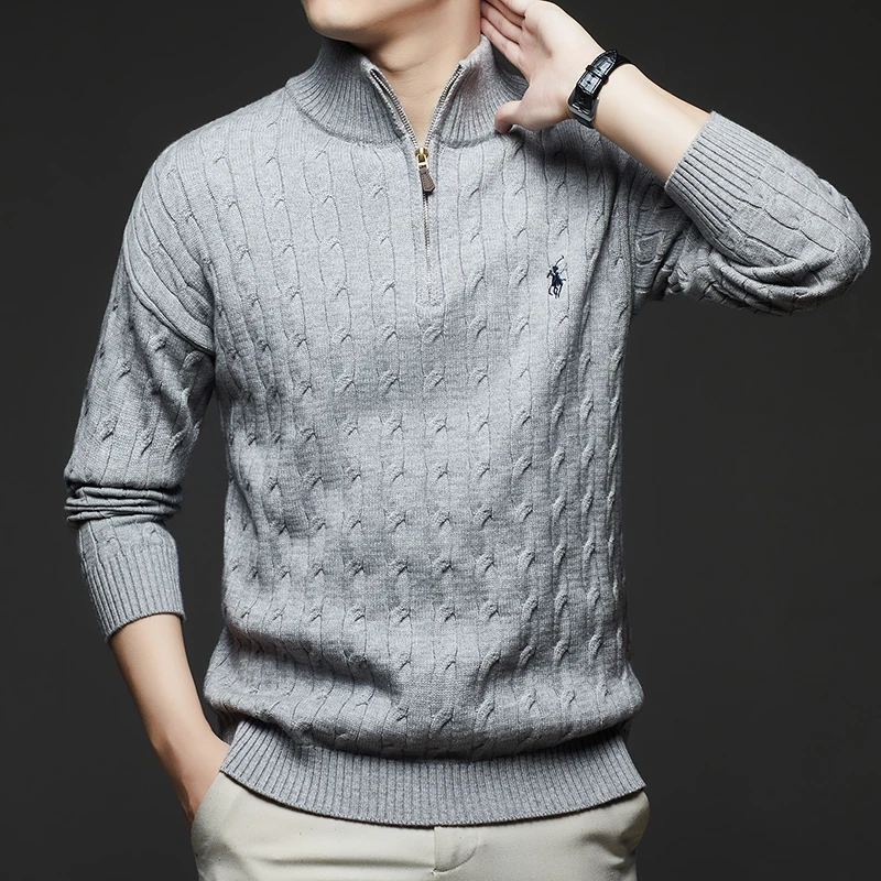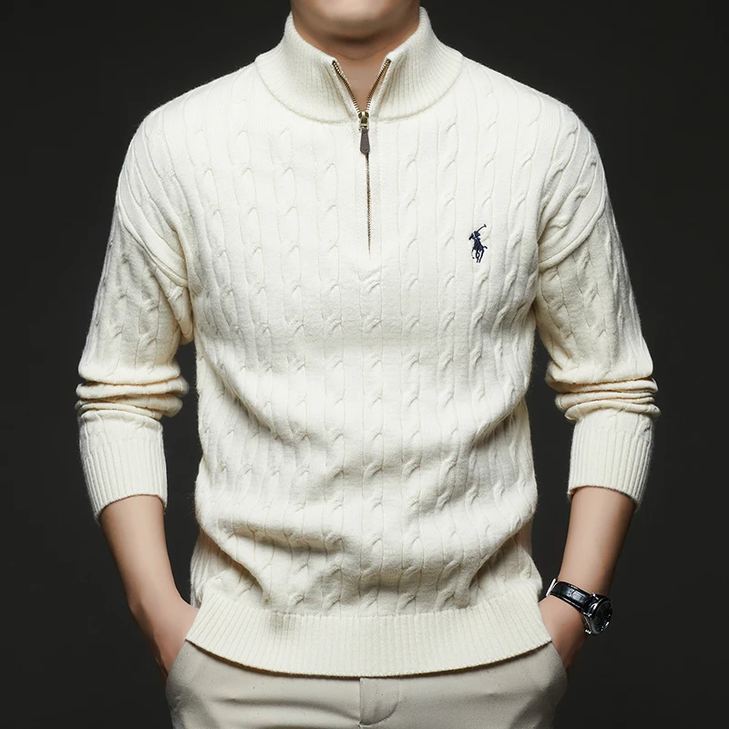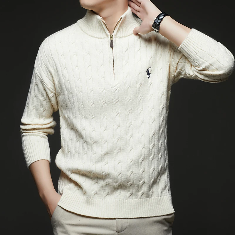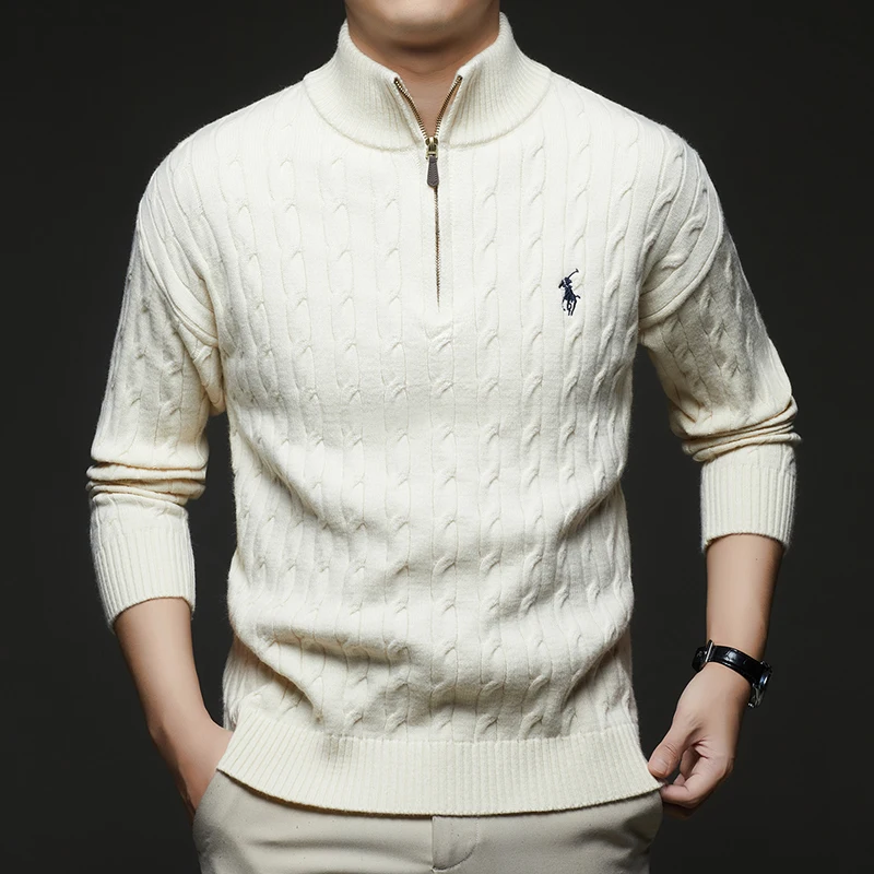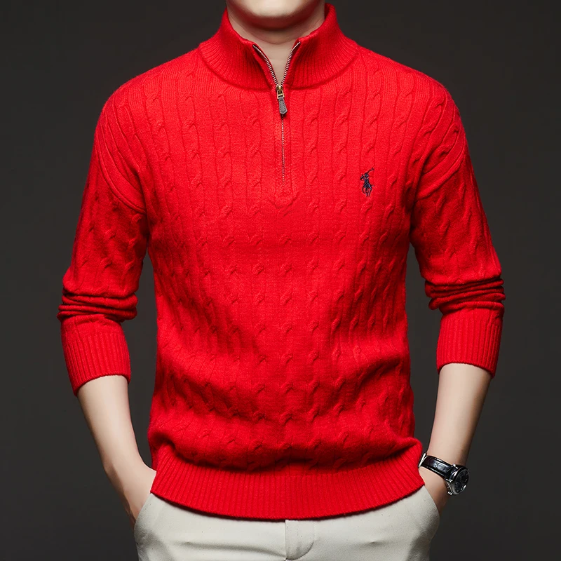 Autumn and Winter New Men's Small Horse Logo Trendy Fashion Half Zipper Autumn and Winter Top Long Sleeved Plaid Sweater Jacket