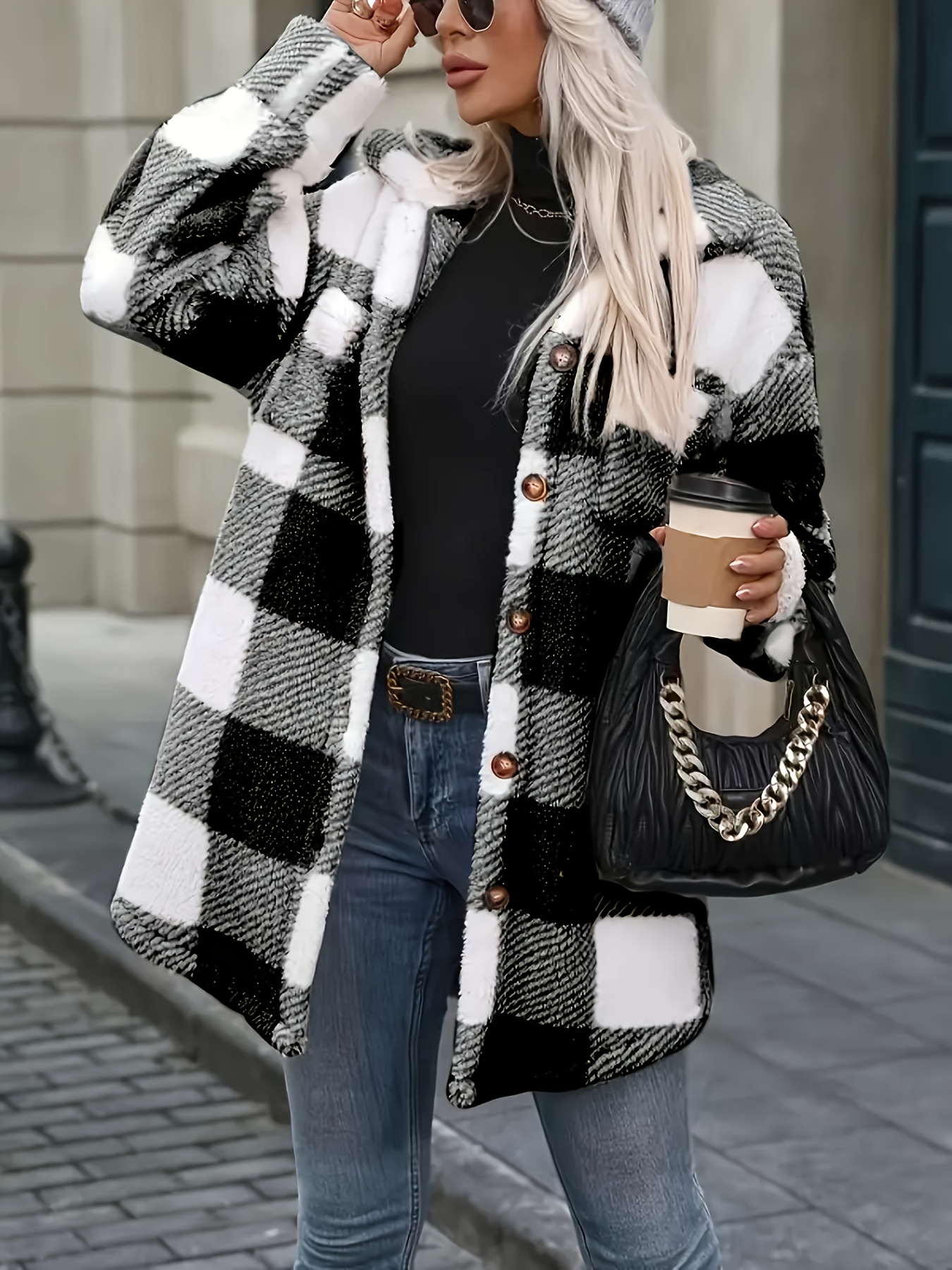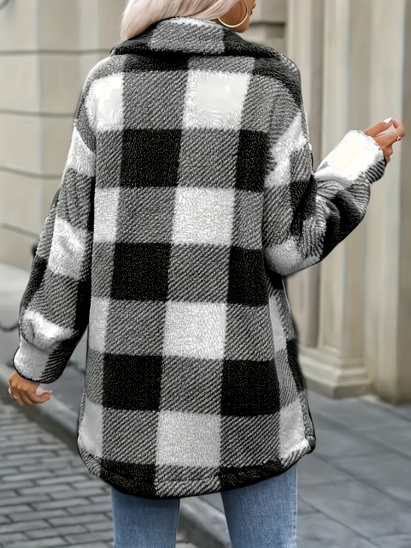 Women's Coat, Elegant Fashionable Jacket for Ladies, Black and White Checkered Drop Shoulder Teddy Bear Plush Women
